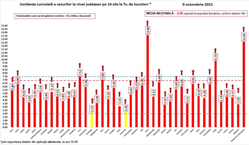 Doar două județe din România au rămas în zona galbenă, restul fiind pe roșu cu o rată de infectare de peste 3 cazuri la mia de locuitori. În Harghita și Covasna incidența este de 2,26, respectiv 2,13. Cel mai mare indice COVID-19 este în Ilfov și București, 13,6, respectiv 12,65.