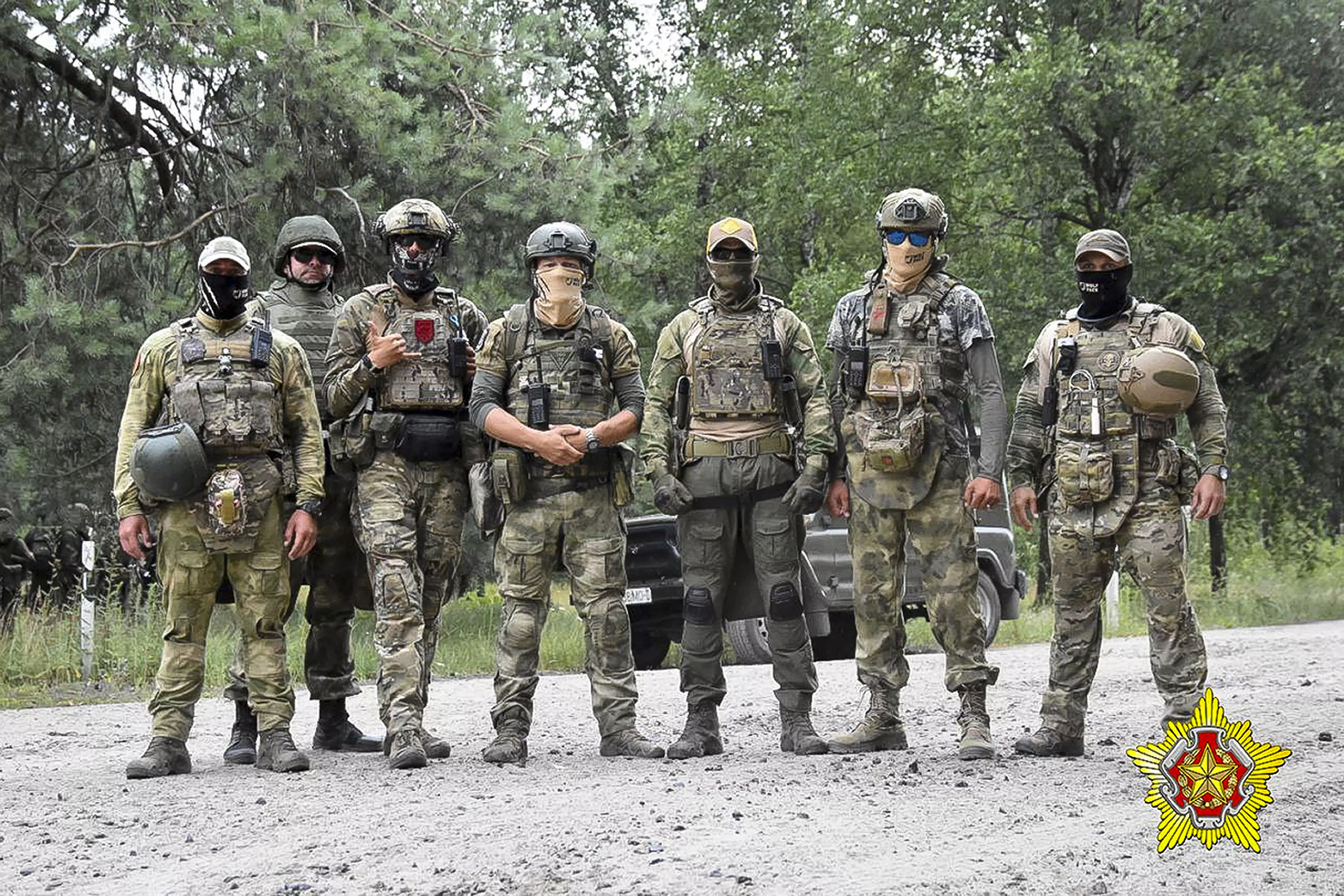 mercenari Wagner si soldati belarusi pozeaza impreuna in timpul exercitiilor militareFoto: Belarus’ Defense Ministry / AP / Profimedia