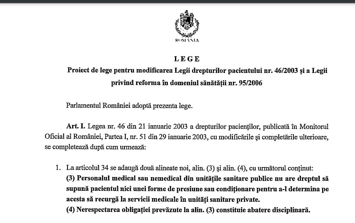 O propunere legislativă din decembrie 2023, inițiată de mai mulți parlamentari USR, și-a propus, conform inițiatorilor, să interzică personalului din sistemul de sănătate publică să pună presiune pe pacienți ca aceștia să acceseze servicii medicale private. Proiectul, momentan blocat în Parlament, a primit, în februarie 2024, aviz negativ de la Guvernul României.