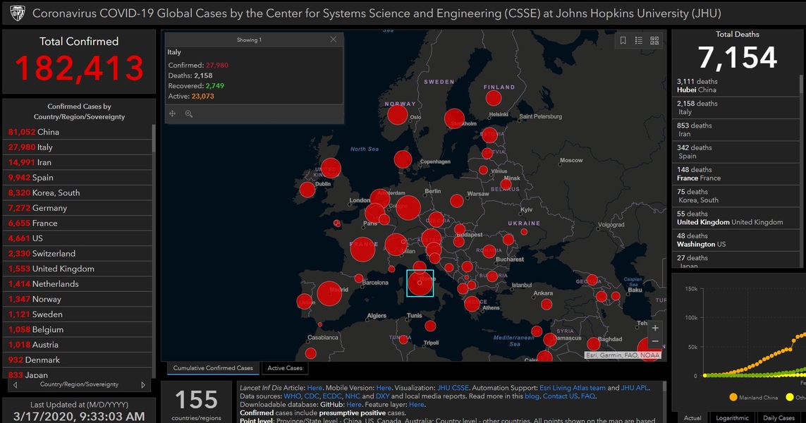 Peste 182.000 de cazuri de îmbolnăviri la nivel mondial, peste 7.100 de decese confirmate și circa 79.400 de pacienți vindecați – așa rată situația la zi a pandemiei de coronavirus din lume. În Europa Italia este în cea mai gravă situație: 28.000 de infectați, peste 2.150 de morți. Apoi urmează Spania cu aproape 10.000 de cazuri confirmate și 342 de decese. Franța, Germania, Elveția, Olanda, Belgia și Marea Britanie sunt și ele în situații dificile.