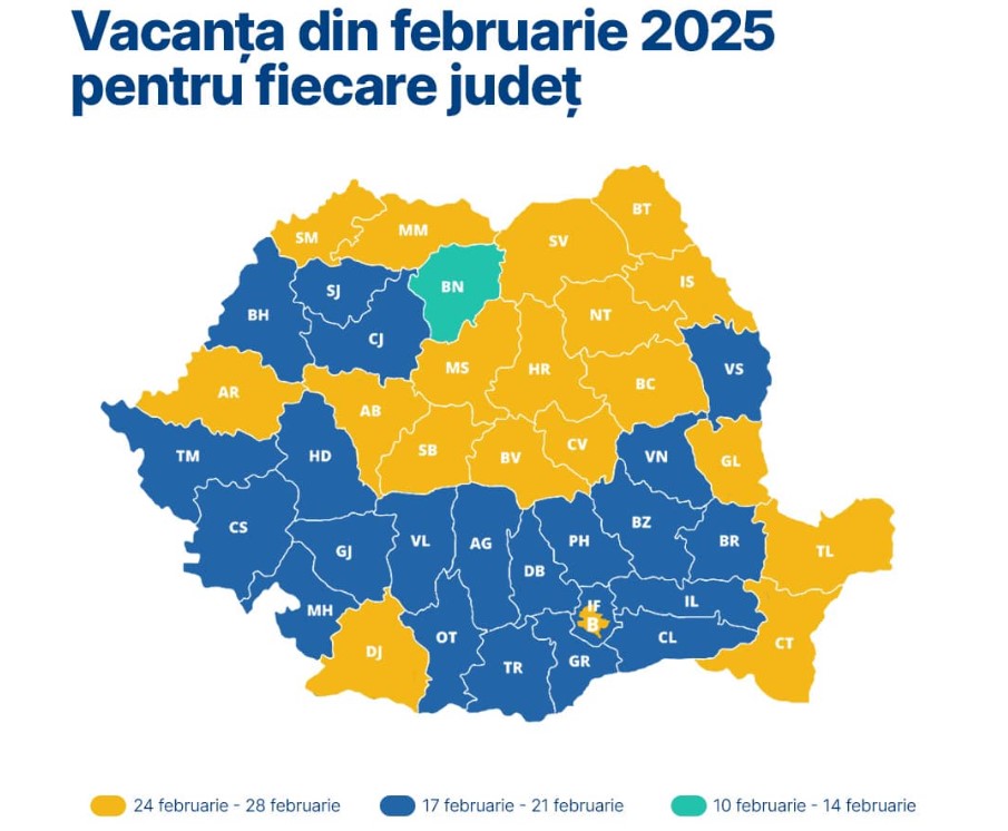 „Util pentru părinți: în cazul în care nu ați fost încă anuntați de către școli, mai jos găsiți harta cu vacanța din februarie 2025 pentru fiecare județ, realizată de colegii mei. Informațiile privind vacanța din februarie 2025 ne-au fost transmise de inspectoratele școlare”, a scris Ligia Deca într-o postare pe Facebook.