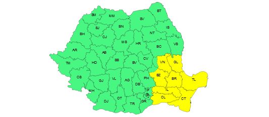 Meteorologii au emis o avertizare Cod galben privind intensificări ale vântului, valabilă de sâmbătă, de la ora 3.00, până duminică, la ora 10.00, în sudul Moldovei, jumătatea estică a Munteniei şi în Dobrogea, unde vântul va avea intensificări cu viteze în general de 55…70 km/h. Acest Cod galben va fi în vigoare în judeţele Galaţi, Brăila şi parţial în Vrancea şi Buzău.