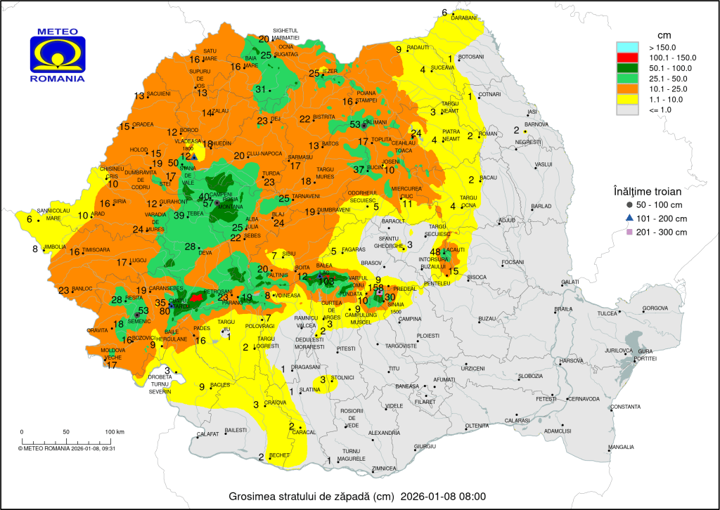 La munte, stratul de zăpadă avea o grosime de 158 cm la Omu și 108 cm la Bâlea.