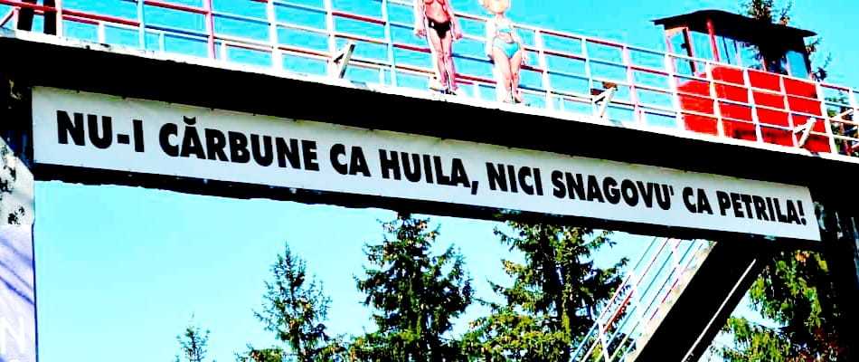 Panoul reprezintă o imagine a cuplului Ceauşescu în costume de baie, iar în partea de jos se afla mesajul ”Nu-i cărbune ca huila, nici Snagovu’ ca Petrila”.