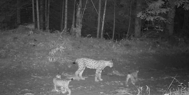 O femelă râs şi cei doi pui ai săi au fost surprinşi de o cameră de supraveghere amplasată într-o pădure din judeţul Neamţ, imaginile fiind publicate pe Facebook de Romsilva.