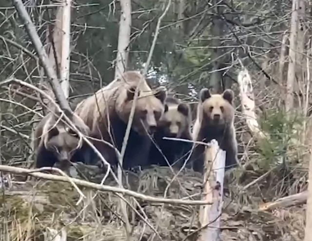Regia Naţională a Pădurilor publică, pe reţelele de socializare, imagini inedite care prezintă reacţiile unei ursoaice cu trei pui atunci când vede, în habitatul său natural, un om. Cei trei pui de urs par curioşi, în timp mama caută să îi îndepărteze de locul în care se află omul.