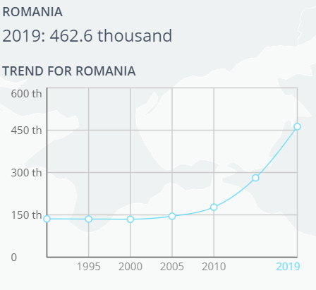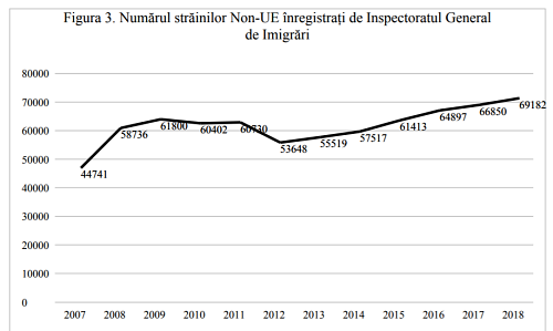 Datele Inspectoratului General pentru Imigrări din 2018 raportează un număr total de 120.399 de cetățeni străini înregistrați. Dar numărul celor care sunt născuți în altă țară și care trăiesc în România este de aproape patru ori mai mare. Astfel, conform Națiunilor Unite, numărul de persoane care s-au născut în afara României (imigranți cu cetățenie română, cetățeni ai altor țări UE, ai altor țări terțe, sau refugiații) este de 462,000 pe un trend de creștere (vezi Figura 2).