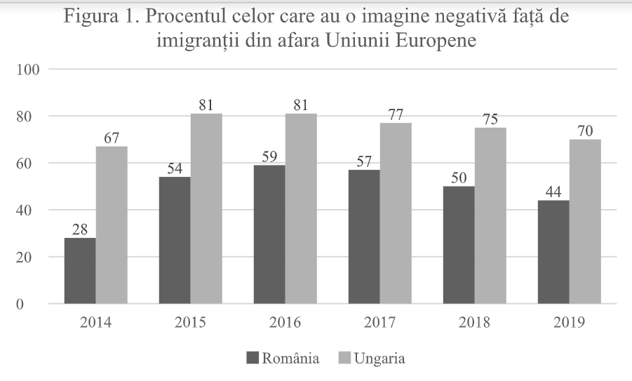 Conform World Values Survey din 2018, 23% dintre români menționează imigranții ca persoane pe care nu și le-ar dori ca vecini, un procent apropiat de media europeană, în contextul în care în România migrația este un fenomen aflat abia la început. Vom discuta aceste date în paralel cu datele despre Ungaria, pentru a vedea și care este efectul posibil al ideologiei anti-migraționiste a guvernului Orban față de România, unde nu avem o asemenea situație. Așa cum se poate vedea și în Figura 1, Eurobarometrul arată și un trend descrescător al procentului de cetățeni care au o imagine negativă despre imigranții din afara UE atât în România cât și în Ungaria.