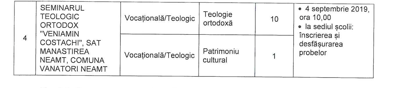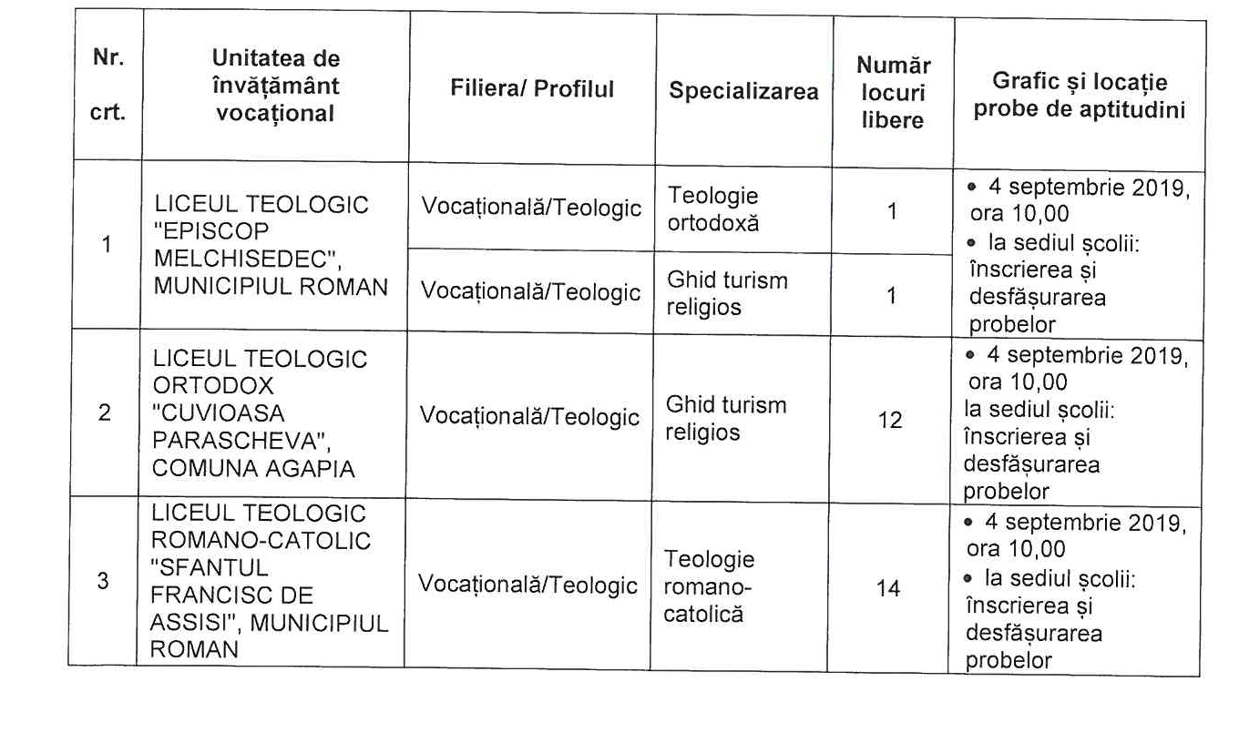 Lista locurilor libere la învățământul vocațional din județul Neamț și graficul desfășurării probelor de aptitudine: