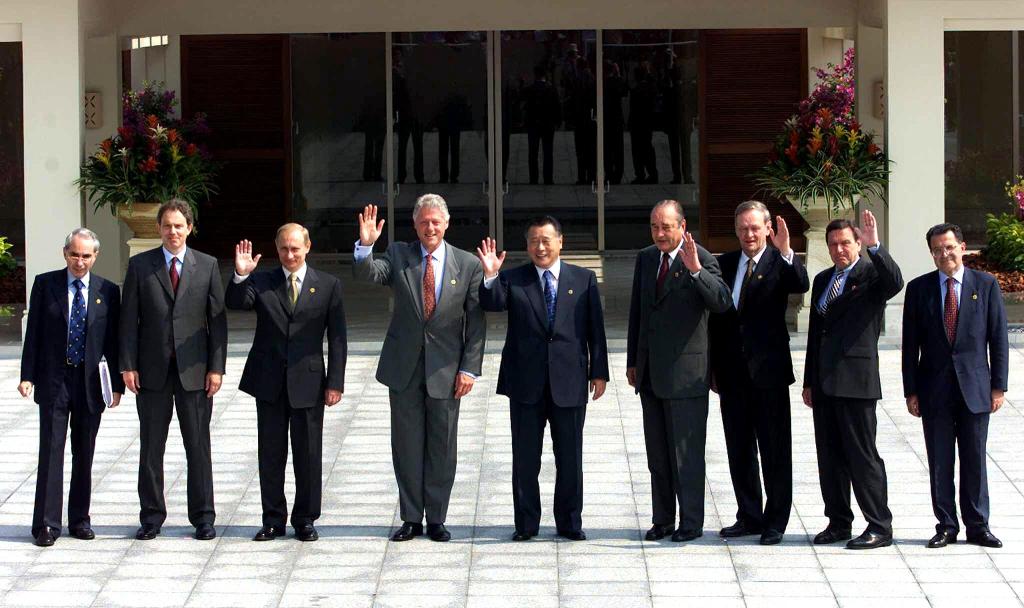 Putin, al treilea din stânga, se află între două figuri care au marcat ultima parte a secolului al XX-lea: premierul englez Tony Blair și președintele american Bill Clinton.