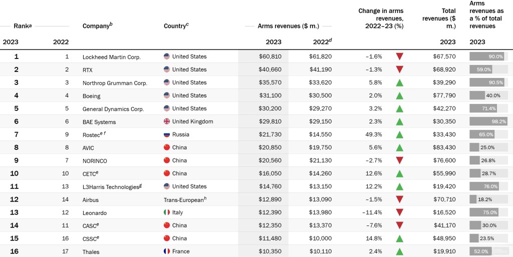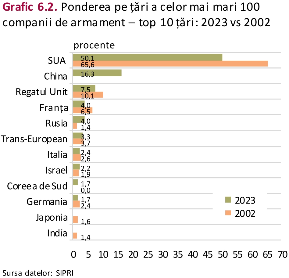 SUA au dominat piața de armament, cu o cotă care a oscilat între aproape 70% la începutul anilor 2000 și puțin peste 50%, în prezent. Totuși, anul 2015 marchează un moment de cotitură: China pătrunde abrupt în topul mondial, aducând 7 companii direct în primele 25, după venituri. Această ascensiune a Beijingului a însemnat nu doar creșterea cifrei de afaceri globale, ci și o reconfigurare a raportului de forțe: SUA rămân lideri, dar nu mai sunt singuri.