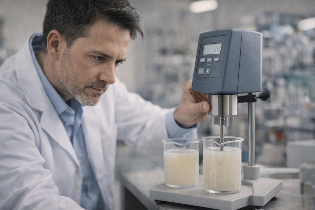 În laborator, două citiri la 5 minute cu un viscozimetru pot separa o rețetă stabilă de una care cade la transfer