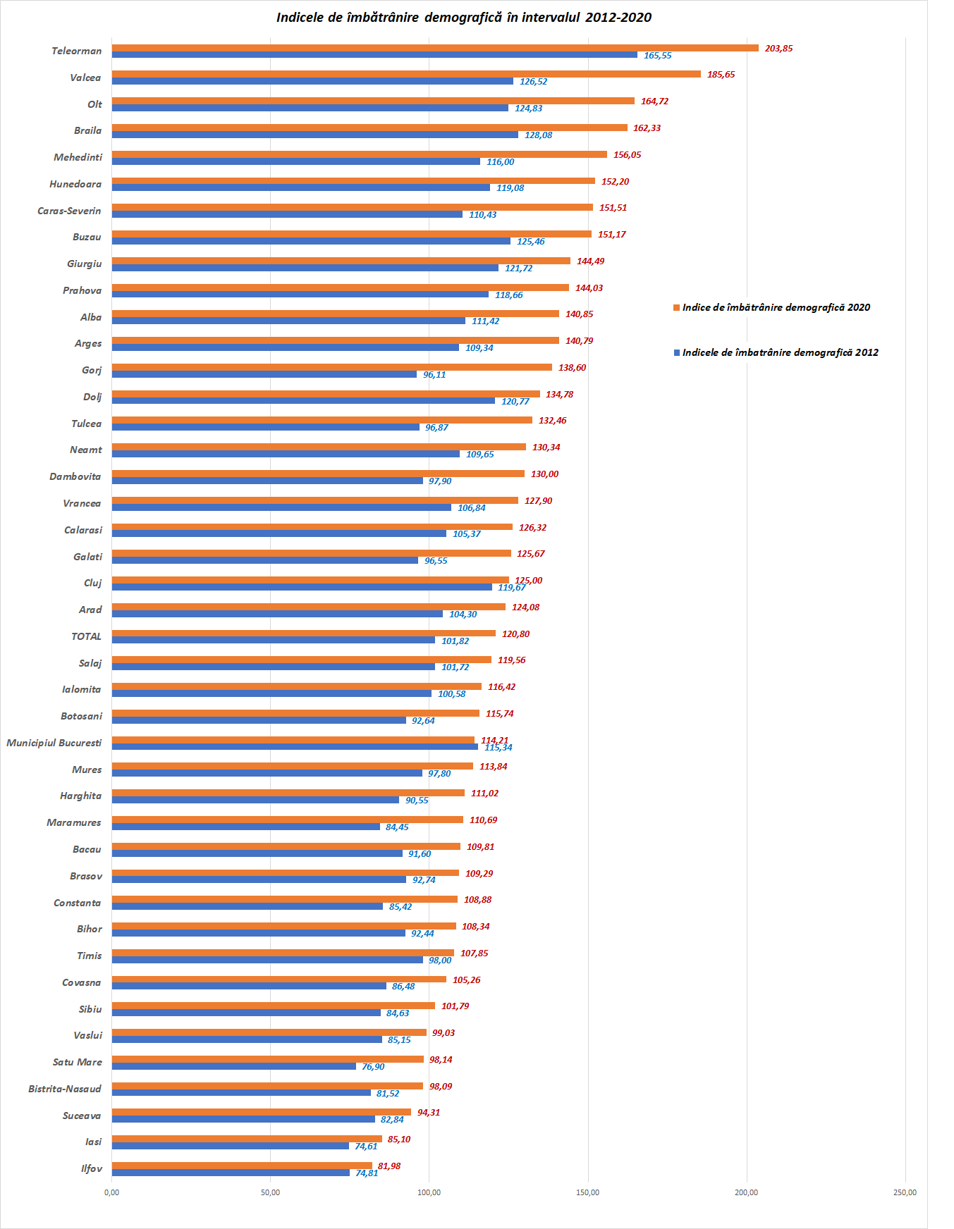 Doar 6 județe din 42 au acest indice de îmbătrânire demografică mai mic de 100, adică au seniori mai puțini decât tineri de cel mult 14 ani.