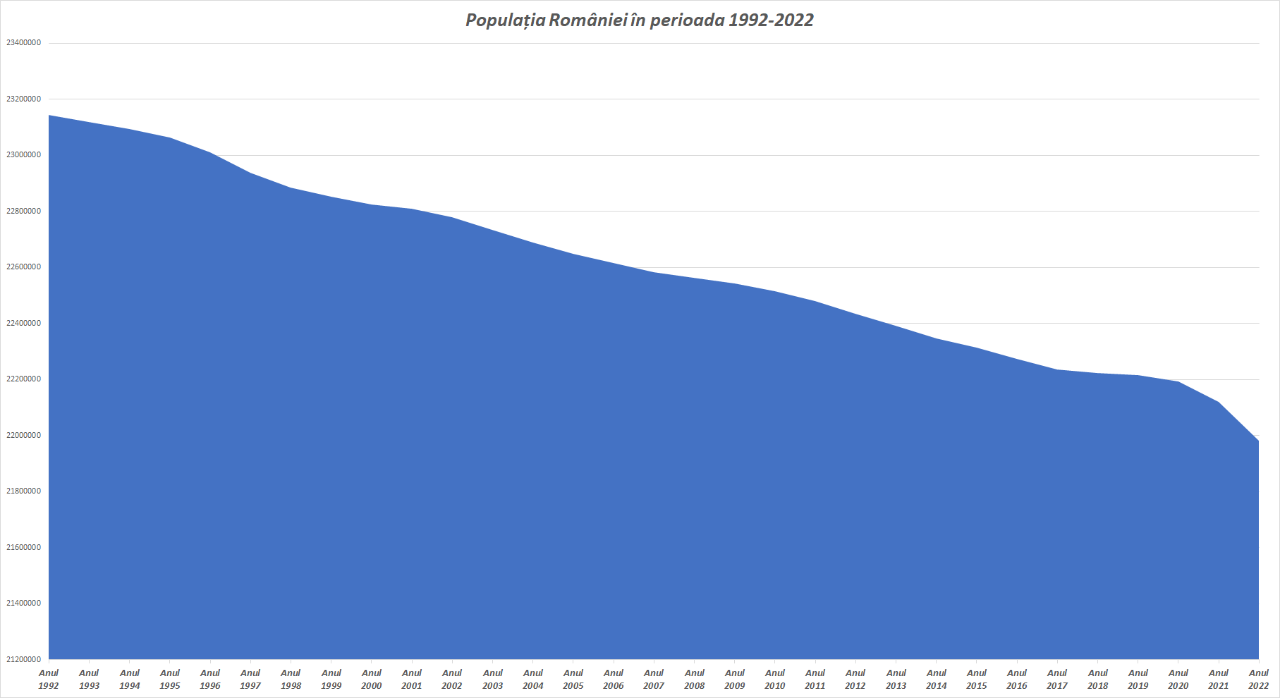 Populația după domiciliu a României la 1 ianuarie 2022 era de 21,9 milioane de locuitori, potrivit datelor transmise joi de Institutul Național de Statistică. Față de acum 30 de ani suntem mai puțini cu 1,16 milioane, cam cât ar însuma Cluj, Iași, Timișoara și Constanța luate la un loc.