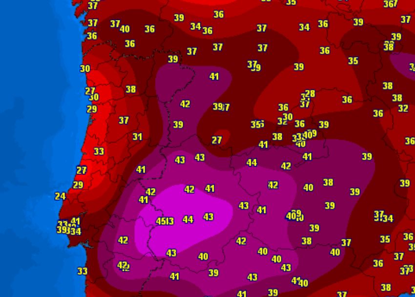 Temperaturile in Spania si Portugalia, pe 13 iulie 2022Foto: Meteociel
