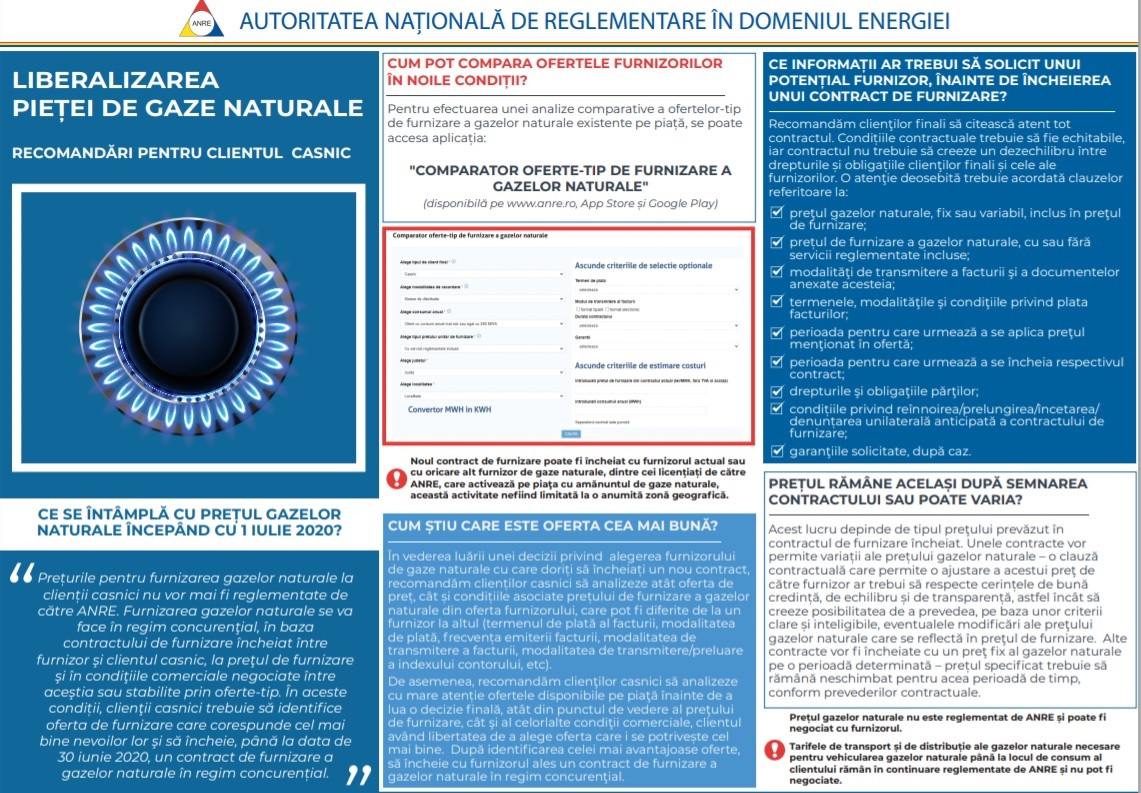 De asemenea, ANRE recomandă clienţilor casnici să analizeze cu mare atenție ofertele disponibile pe piaţă înainte de a lua o decizie finală, atât din punctul de vedere al preţului de furnizare, cât şi al celorlalte condiţii comerciale, clientul având libertatea de a alege oferta care i se potrivește cel mai bine. După identificarea celei mai avantajoase oferte, să încheie cu furnizorul ales un contract de furnizare a gazelor naturale în regim concurenţial.