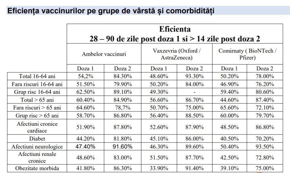 Concluziile specialiștilor sunt îmbucurătoare. Eficiența împotriva COVID-19 în cadrul grupelor de risc este între 30 – 60% după doza 1, indiferent de tipul de vaccin. Excepție fac doar persoanele aflate în grupa cu imunitate scăzută (imunocompromiși), unde procentul de eficiență este de 4%.