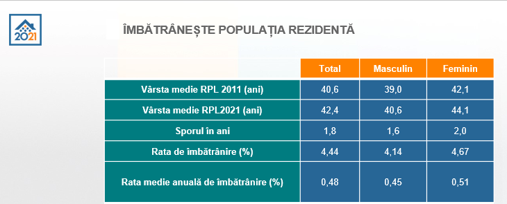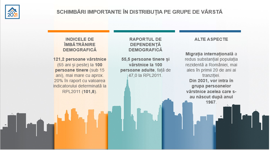 De asemenea, ponderea românilor având vârsta de sub 65 de ani a scăzut de la aproape 20% la puțin peste 18%, în vreme ce ponderea celor de peste 65 de ani a crescut de la 16% la aproape 20%.