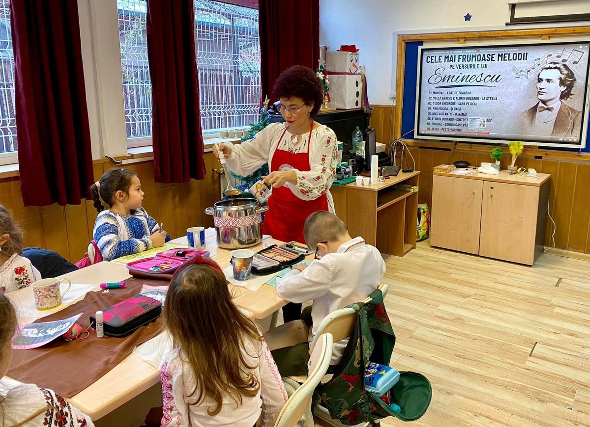 ”De atunci, an de an, îi primeşte cu emoţie pe copii, oferindu-le un ceai cald, o turtă dulce aromată, multă dragoste de poezie şi de Eminescu, dar şi experienţe inedite, cum ar fi scrierea cu tocul improvizat dintr-o pană, pe o hârtie ”învechită” chiar de ei, cu ajutorul unui… plic de ceai negru, spune învăţătoarea.