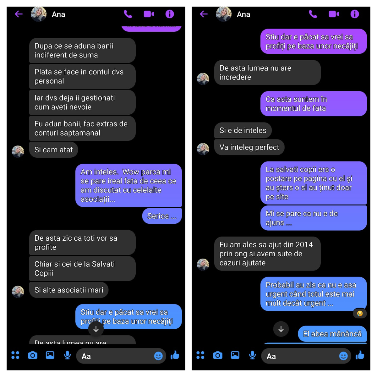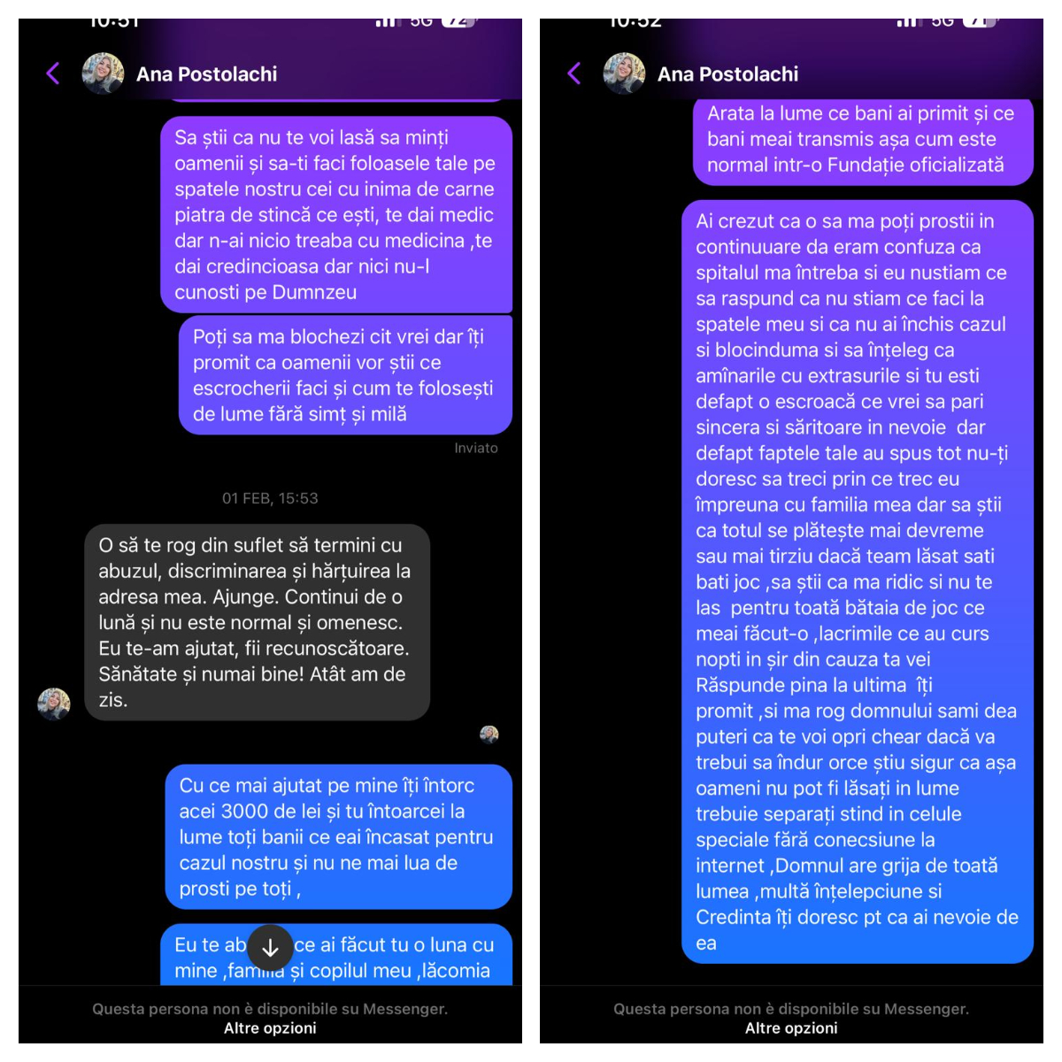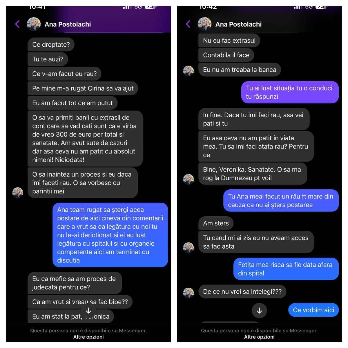 „Am avut discuții cu reprezentanții spitalului din Italia, că au văzut că cerem bani și noi avem asigurare. Nu înțelegeam ce se întâmplă, eram într-o stare deplorabilă. Am rugat-o: Ana, șterge postările, că îmi zic oamenii că sunt escroacă. Zicea că le șterge, dar tot acolo erau. Toți cunoscuții mei scriau în comentarii, într-un minut-două, cineva le ștergea. Îi scriau în privat, îi bloca”, povestește mama.