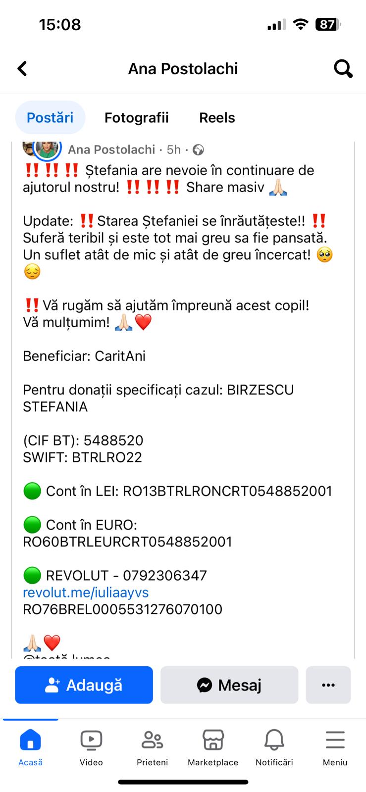 Contul de Revolut are revtag @iuliaayvs, iar numele care apare în căutarea din aplicația Revolut este Iulia P.. Poate fi Iulia Postolachi, mama Anei Postolachi, și ea foarte activă pe rețelele sociale când vine vorba de promovarea cazurilor pe zeci de grupuri online. Revtag-ul ei apare în mai toate postările de la CaritAni, pentru donații.