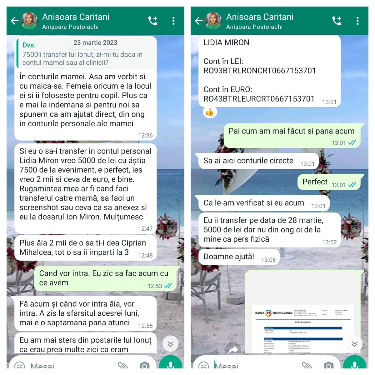 „Anișoara” i-a dat două conturi de la Banca Transilvania pe numele „Lidia Miron”, spunând că „femeia e la locul ei și îi folosește pentru copil”, dar și că „e mai la îndemână și pentru noi să spunem că am ajutat direct”. Apoi a adăugat că o să-i trimită și ea 5.000 de lei, „dar nu din ONG, ci de la mine, ca persoană fizică”.