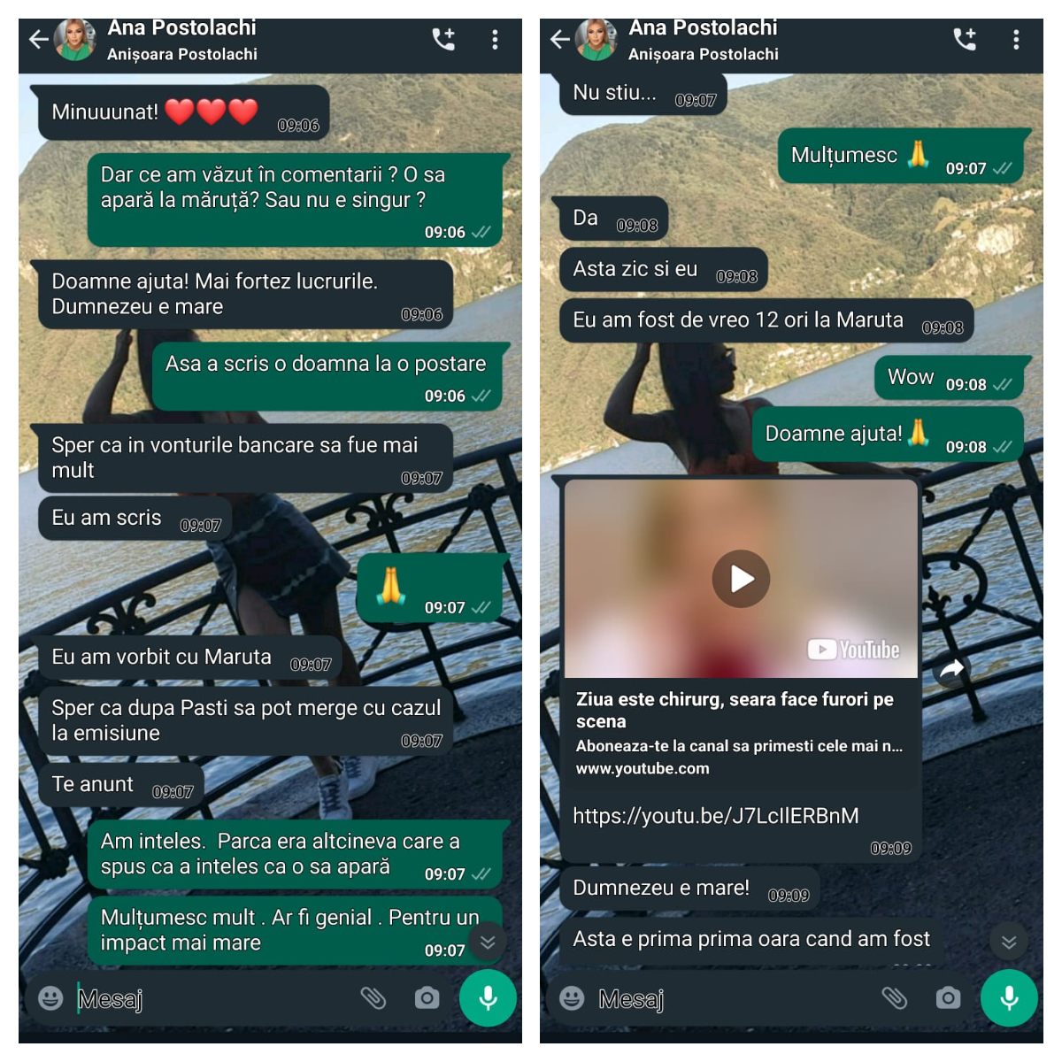 Teodora Bobeanu, din Constanța, i-a scris pe Messenger Anei Postolachi în martie 2023, după ce Postolachi se oferise să o ajute. Anișoara a intrat pe postarea de pe Facebook a Teodorei Bobeanu, a comentat și i-a propus un ajutor.