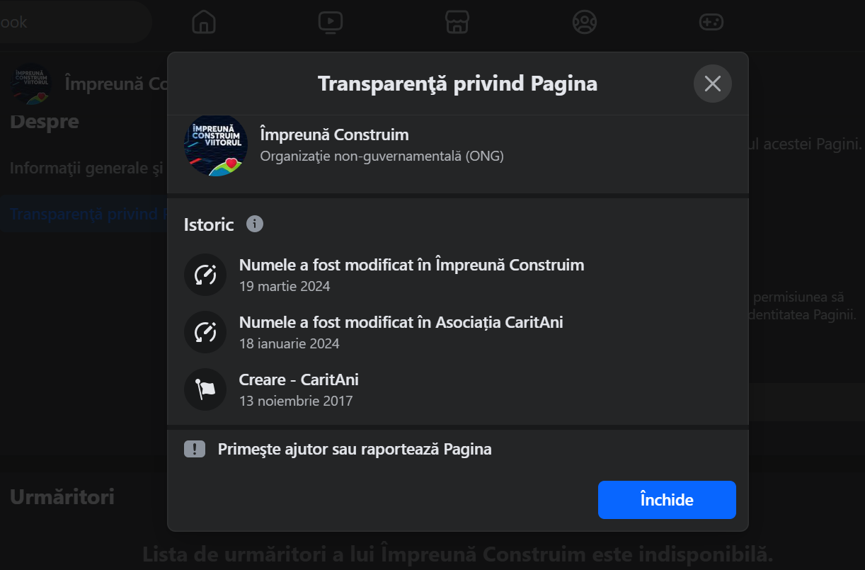 O căutare în imensele baze de date publice nu găsește niciun rezultat. Este și motivul pentru care conturile folosite sunt unele personale. În 19 martie, pagina de Facebook CaritAni și-a schimbat numele în „Împreună Construim”.