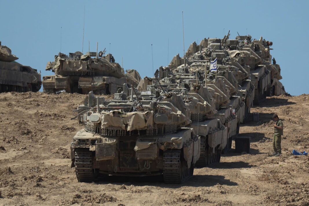 Tancurile israeliene Merkava, staționate de-a lungul frontierei cu Fâșia Gaza, în timp ce Israelul a declanșat o nouă campanie de bombardamente de amploare asupra orașului Gaza, pe 16 septembrie 2025.
