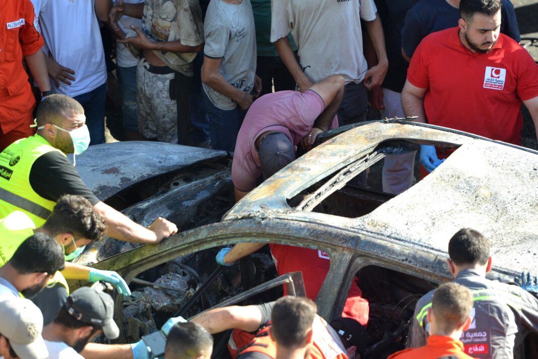Paramedicii inspectează un vehicul carbonizat, lovit într-un atac aerian israelian, în zona Ayrouniyeh, lângă orașul-port Tripoli din nordul Libanului. Foto: Fathi AL-MASRI / AFP / Profimedia