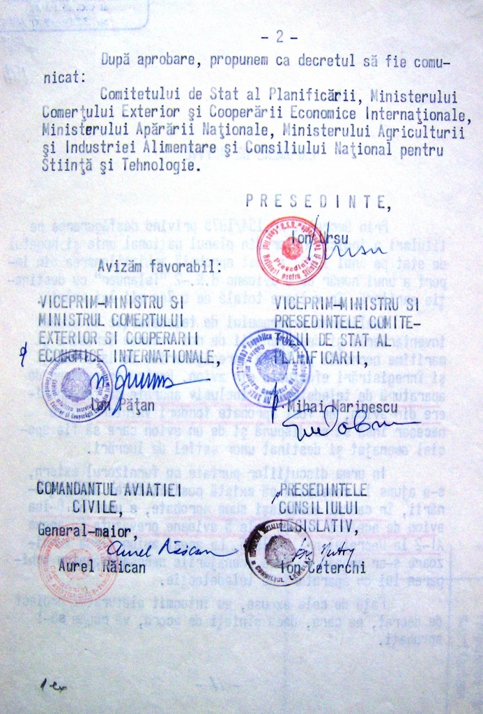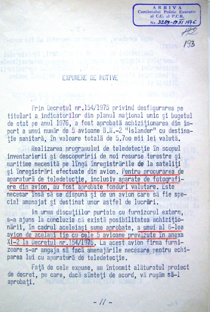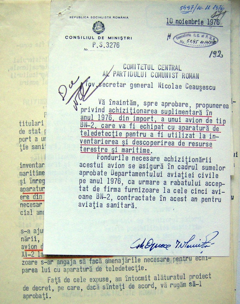 Pentru a nu rămâne necheltuite fondurile stabilite în contul bugetar pentru anul 1976, la acel capitol, Nicolae Ceauşescu a aprobat la 11 noiembrie 1976 proiectul de decret privind achiziţionarea suplimentară a avionului BN-2 „Islander” destinat misiunilor de teledetecţie.