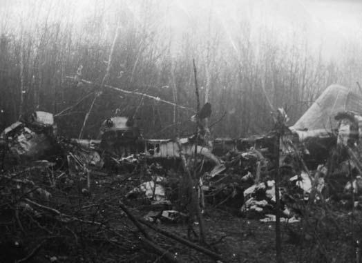 Epava avionului IL-14 P (YR-PCC), prăbuşit la 4 noiembrie 1957 în pădurea din imediata apropiere a aeroportului de la Vnukovo.