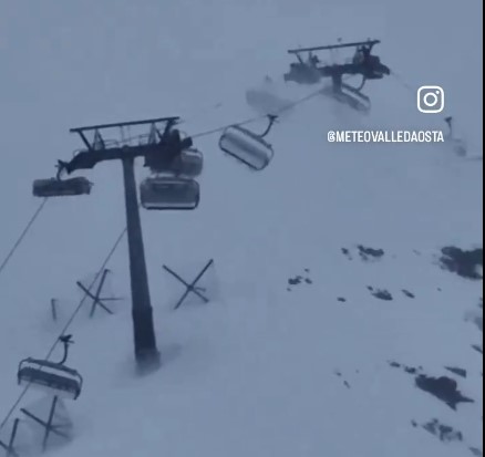 Vântul s-a înteţit pe neaşteptate la Breuil-Cervinia, în Alpii italieni, iar schiorii care stăteau liniştiţi în telescaunul Cretaz au fost surprinşi, joi după-amiază, de rafalele violente de vânt, care de la 20-30 km/h au ajuns brusc la o viteză 110 km/h, în numai câteva momente, potrivit unui site dedicat vremii în Valle d’Aosta.