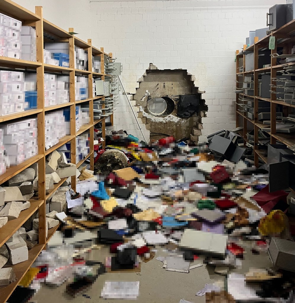 Metoda folosită în spargerea băncii i-a uimit pe anchetatori – hoţii au făcut o gaură în sala de valori cu o bormaşină uriaşă.