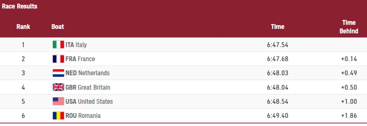 Titlul olimpic de la Tokyo a fost câştigat de Italia (6 min 47 sec 54/100), iar podiumul a fost completat de Franța (6 min 47 sec 68/100) și de Olanda (6 min 48 sec 03/100).