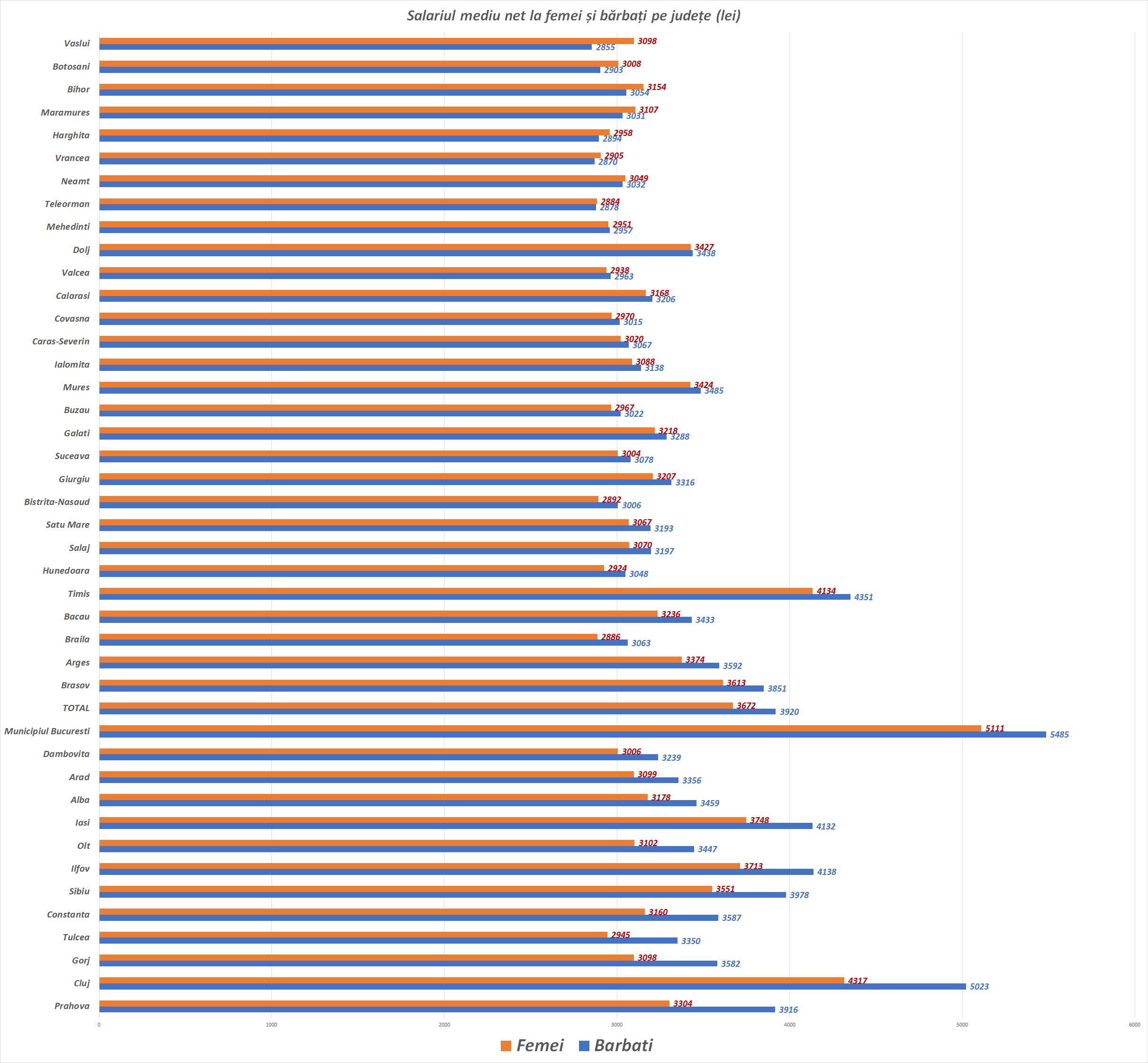 În România sunt 8 județe în care salariul mediu net al bărbaților a fost mai mic decât al femeilor. În Vaslui, un bărbat lua în medie 0,9 bani la fiecare leu câștigat de o femeie.