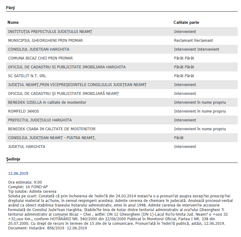 Dincolo de haz, primarul Gheorghe Oniga descrie pe larg cazul și aduce și câteva precizări legate de soluția dată de instanța din Ploiești: Secretarul care era în funcție în anul 1998, a semnat un proces-verbal de grănițuire, lucrare comandată de județul Harghita, respectiv orașul Gheorgheni, în vederea efectuării lucrărilor de cadastru în interiorul orașului, proprietatea intravilan și extravilan. Cu niște bani europeni la momentul de atunci, dacă nu mă înșel, și cu o firmă specializată din Ciuc, care conform Legii 2/68 n-au făcut altceva decât au stabilit limitele teritorial-administrative între Neamț și Harghita. Oficiul Județean de Cadastru Harghita și Oficul Județean de Cadastru Neamț și înstituțiile competente din domeniul respectiv recunosc această limita – limita care a fost până acum. H.G. 540/2000 la care face referire instanța – dusă în eroare prin nu știu ce moștenitori, face o confuzie cu administrarea drumurilor naționale. Pentru că H.G. 540/2000 nu face altceva decât împarte drumurile acestea naționale ca și administrație: administrate de Iași până la Km 32, administrate de Ciuc de la Km 32 până în Brașov.