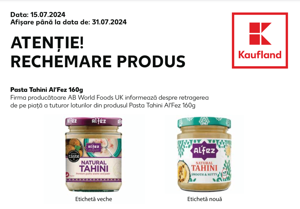 „Această rechemare vizează exclusiv produsul Pasta Tahini Al`Fez 160g. Alte produse vândute de Parmafood Group Distribution SRL, inclusiv alte produse de la producătorul AB World Foods LTD UK nu sunt afectate de această rechemare”, informează sursa citată.