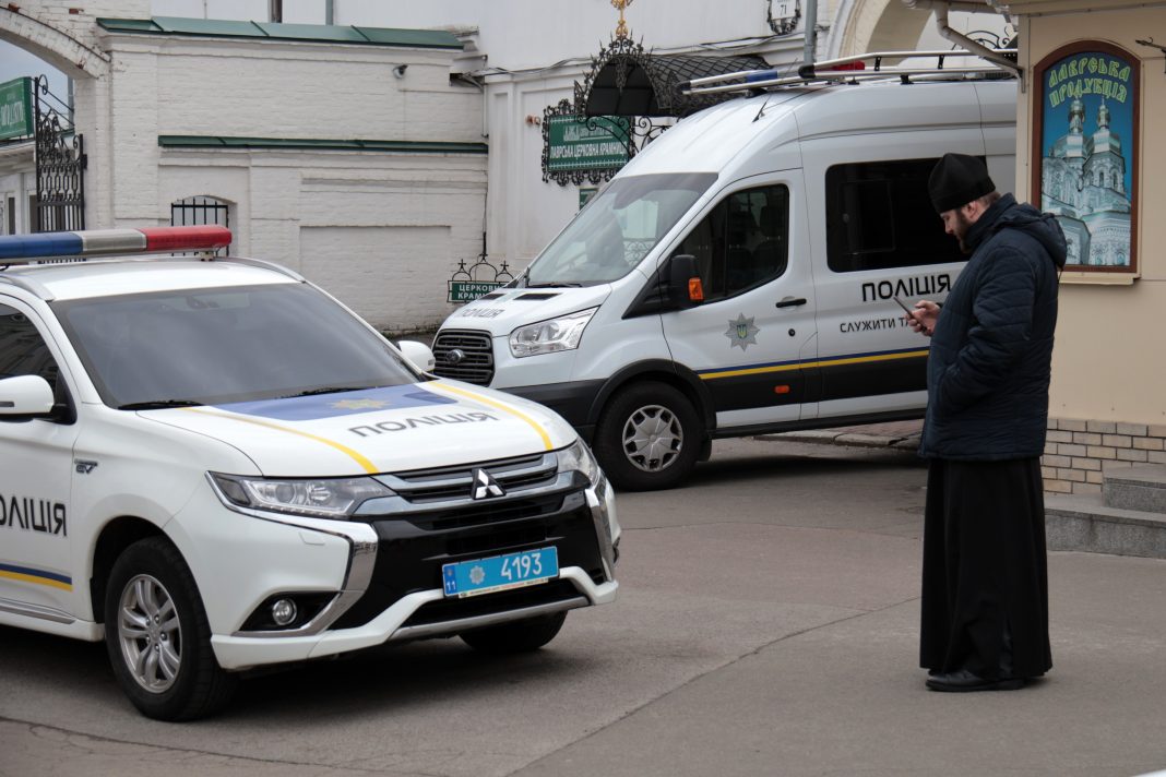 un preot si masini ale politiei la Lavra Pecerska dupa ce Biserica afiliata Moscovei a fost obligata sa paraseasca manastireaFoto: Eugen Kotenko / Avalon / Profimedia