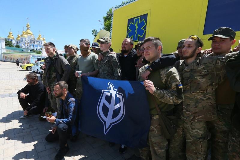 Luptători din Corpul Voluntarilor Ruși pozează pentru o campanie de donare de sânge pentru armatăFoto: Vladimir Sindeyeve/NurPhoto / Shutterstock Editorial / Profimedia