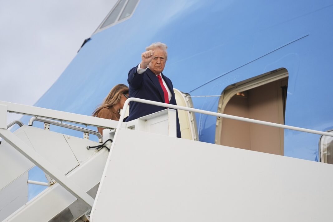 Președintele american Donald Trump, în timp ce se urcă în Air Force One, alături de prima doamnă a SUA, Melania Trump, pe aeroportul Stansted, de lângă Londra, pe 18 septembrie 2025, în Stansted, Anglia.