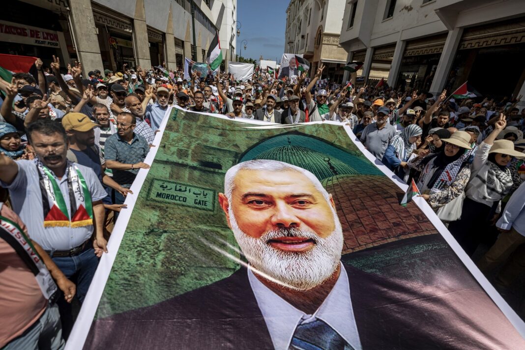 Manifestanți la un miting în Rabat, pe 3 august 2024, protestând față de uciderea liderului Hamas, Ismail Haniyeh.
