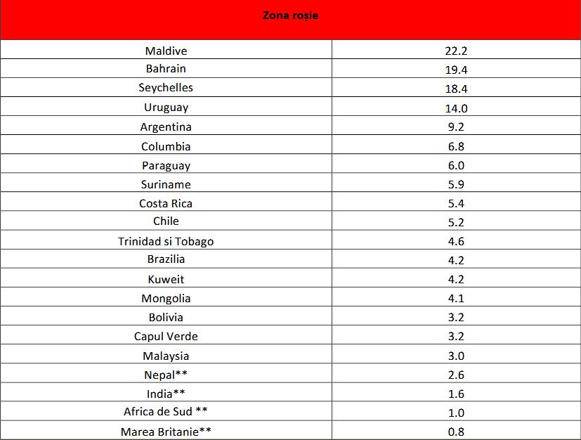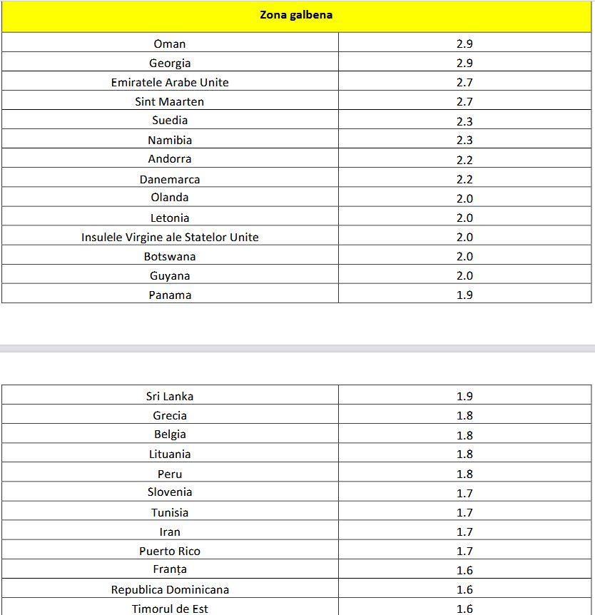 Lista țărilor din zona roșie s-a redus de la 23 de țări la 21, iar statele aflate pe lista galbena au scăzut de la 28 la 26.