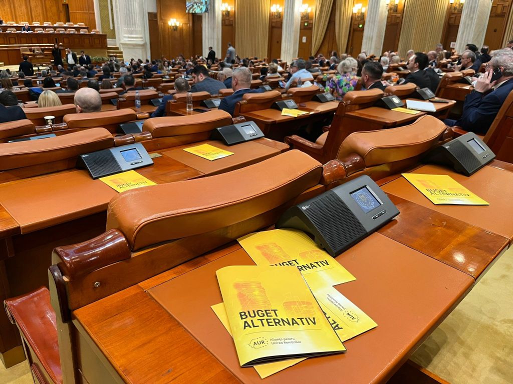 Parlamentarii AUR au pus pe mesele tuturor aleșilor, înainte de începerea ședinței, pliante cu „bugetul alternativ” al partidului.