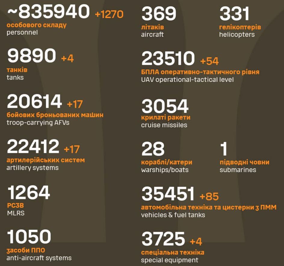 Estimarea ucraineană a pierderilor rusești de miercuri: 1270 soldați, 4 tancuri, 17 alte blindate, 17 tunuri, 85 diferite vehicule și 4 echipamente speciale.