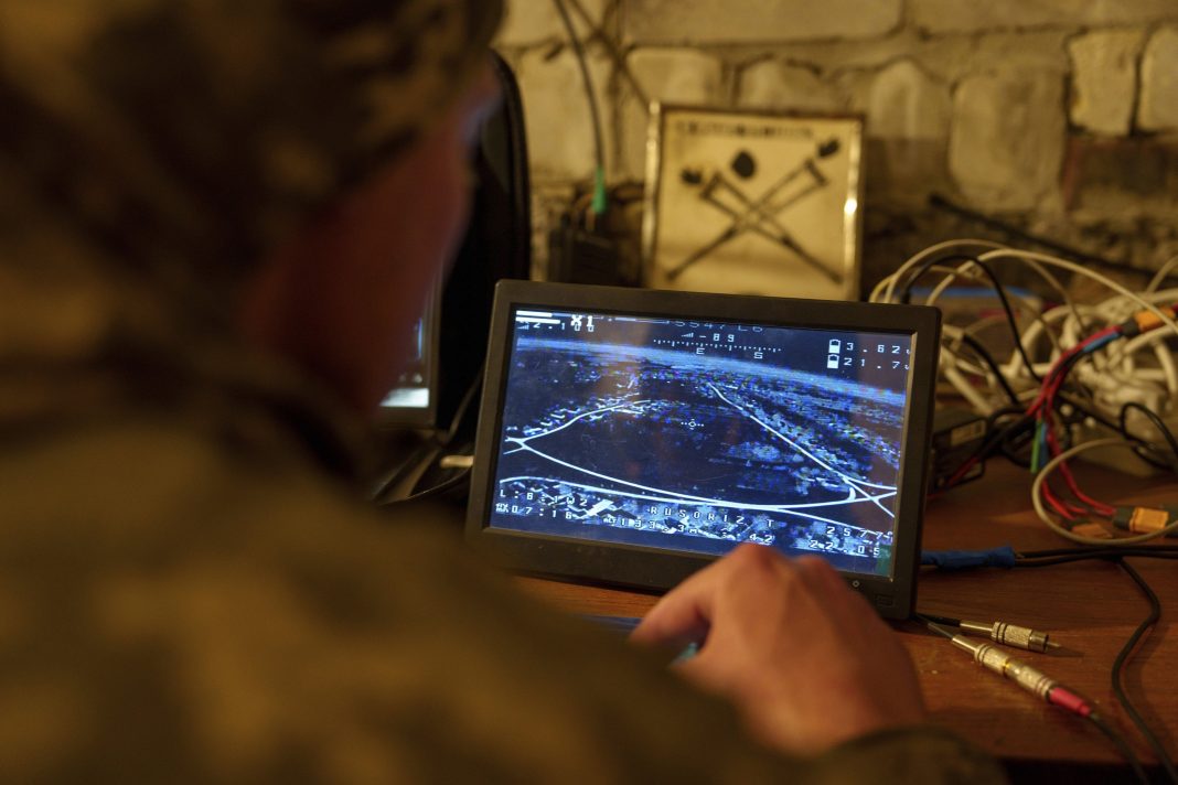 Militar ucrainean operând o dronă kamikaze pentru a lovi forțele ruseFoto: Evgeniy Maloletka / AP / Profimedia