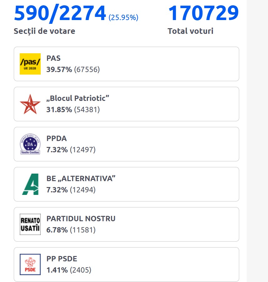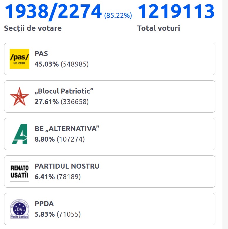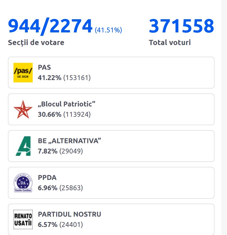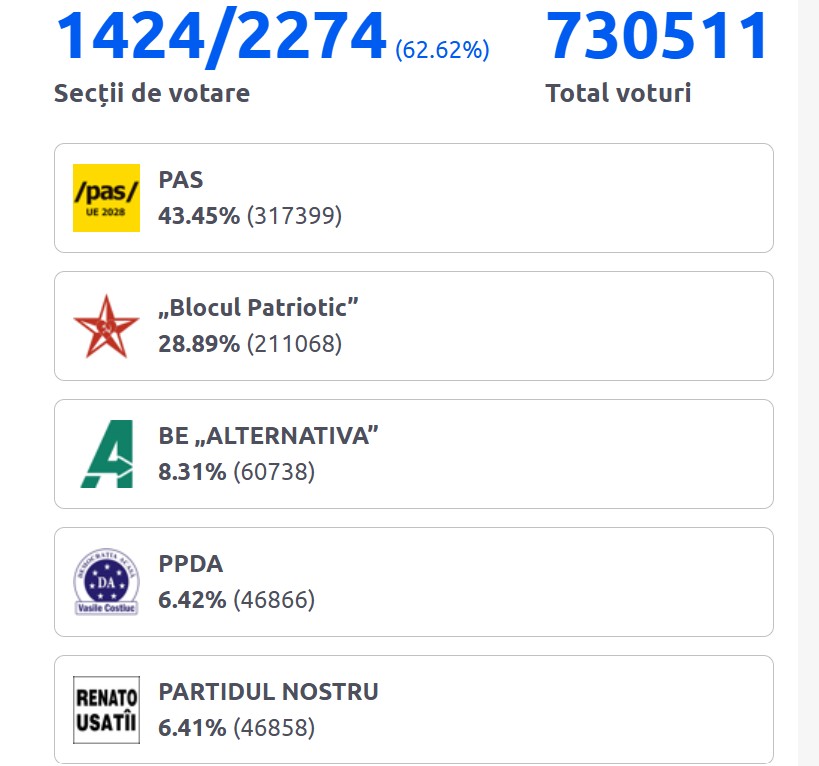 Potrivit unei proiecții a Radio Europa Liberă Moldova, în acest moment, PAS ar urma să primească 49 de mandate în parlamentul cu 101 locuri. Blocul Patriotic ar avea 30 de mandate.