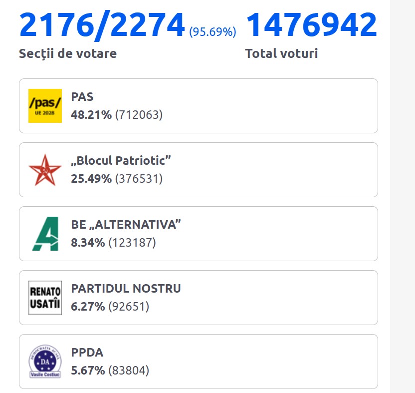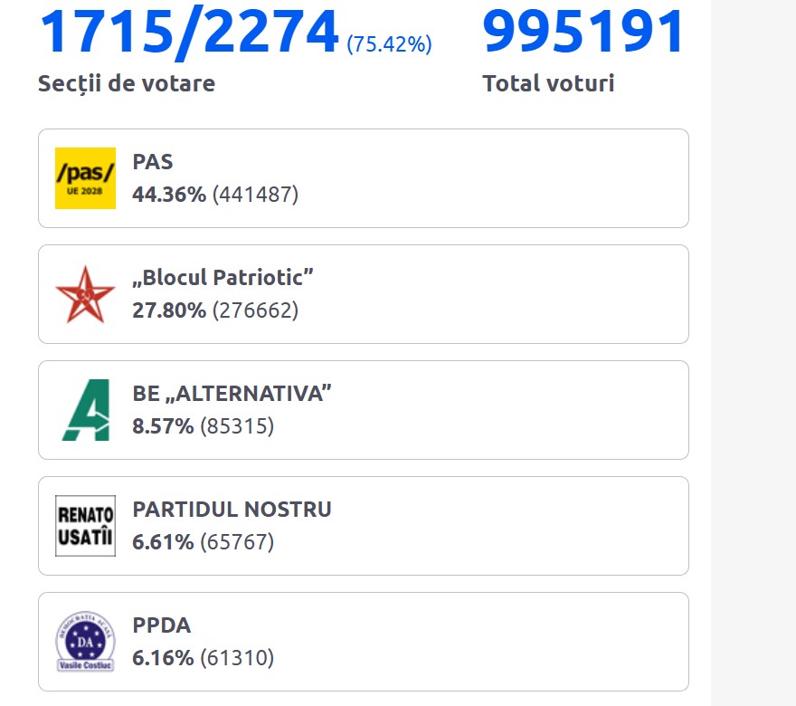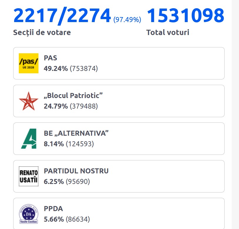 Partidul Acțiune și Solidaritate, al președintei Maia Sandu, are în prezent 49,66% din voturile numărate. În viitorul Parlament vor mai intra „Blocul Patrioților” cu 24,48%, „Alternativa” cu 8,05%, Partidul Nostru cu 6,25% și „Democrația Acasă” cu 5,66%. Au fost numărate până la această oră voturile din 2234 de secții din 2274.