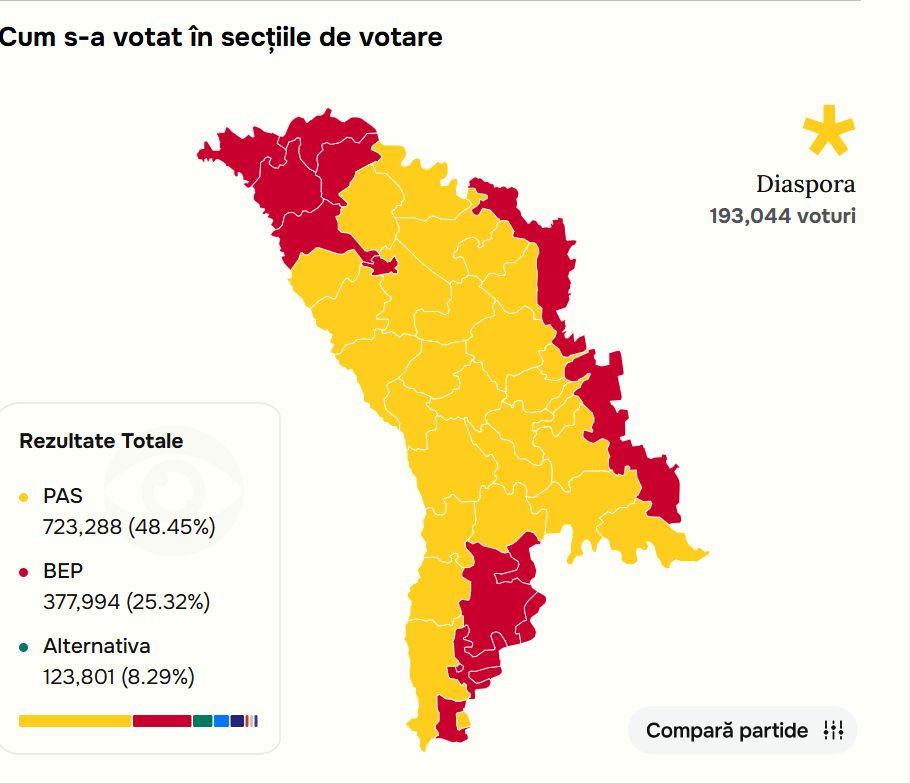 Distribuția votului pe harta Moldovei arată că PAS a câștigat în cele mai multe regiuni, în timp ce „Blocul Patriotic”, alianță de opoziție care are printre lideri pe fostul președinte Igor Dodon, a câștigat în nordul țării, în regiunea autonomă Găgăuzia și în Transnistria.