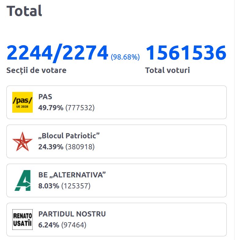 Partidul Acțiune și Solidaritate (PAS) conduce cu 45% din voturi, după procesarea a 1938 procese verbale din 2274.